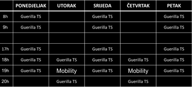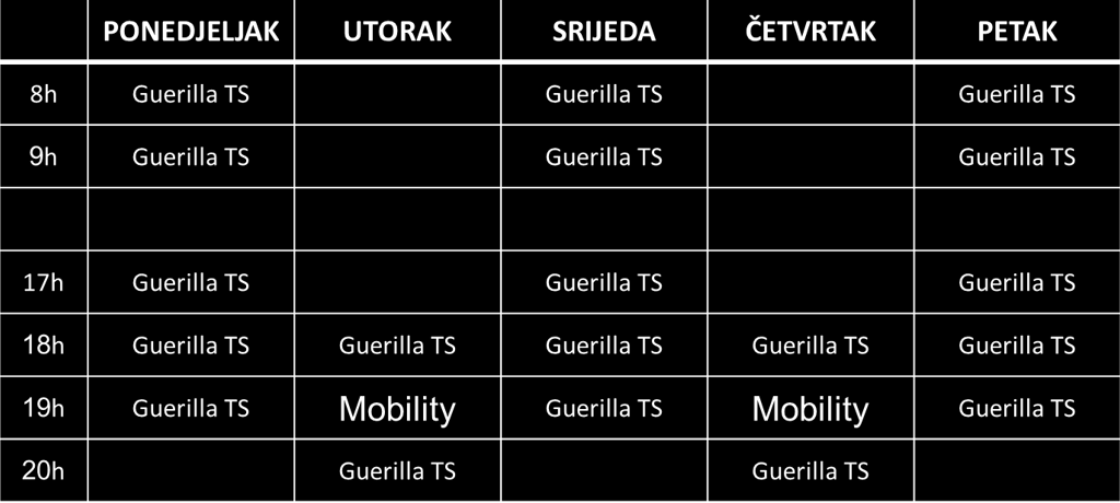 Treninzi u Guerilli se održavaju od ponedjeljka do petka (termina ima u popriličnom broju). Na Guerilla TS treninzima svatko radi po svom programu, što se pokazalo kao odlična kombinacija. Ne samo da početnik može doći na bilo koji termin po rasporedu i dobiti pažnju koja mu je potrebna s obzirom na manjak iskustva u treningu, nego i napredni vježbači lakše i brže napreduju te postižu svoje ciljeve. Upravo to je posebnost grupnih treninga u Guerilli. Vježbači se međusobno razlikuju po brzini napredovanja i usvajanja tehnike. U Guerilli to poštujemo.